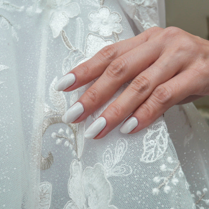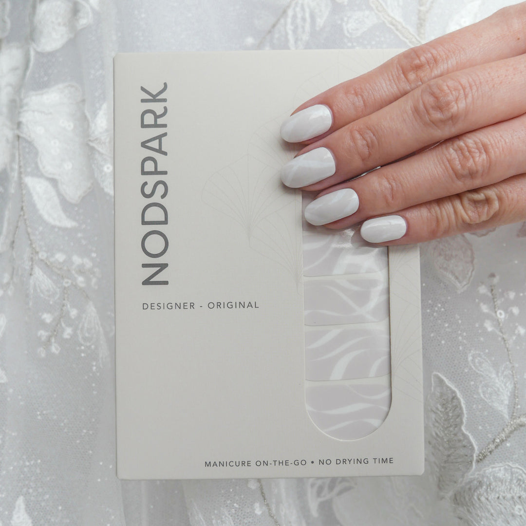 For the bride who'll love some a little more than just an all-white manicure. With the softest swirls of white ribbons cascading down your nails, this set has its allure in its most minimal forms