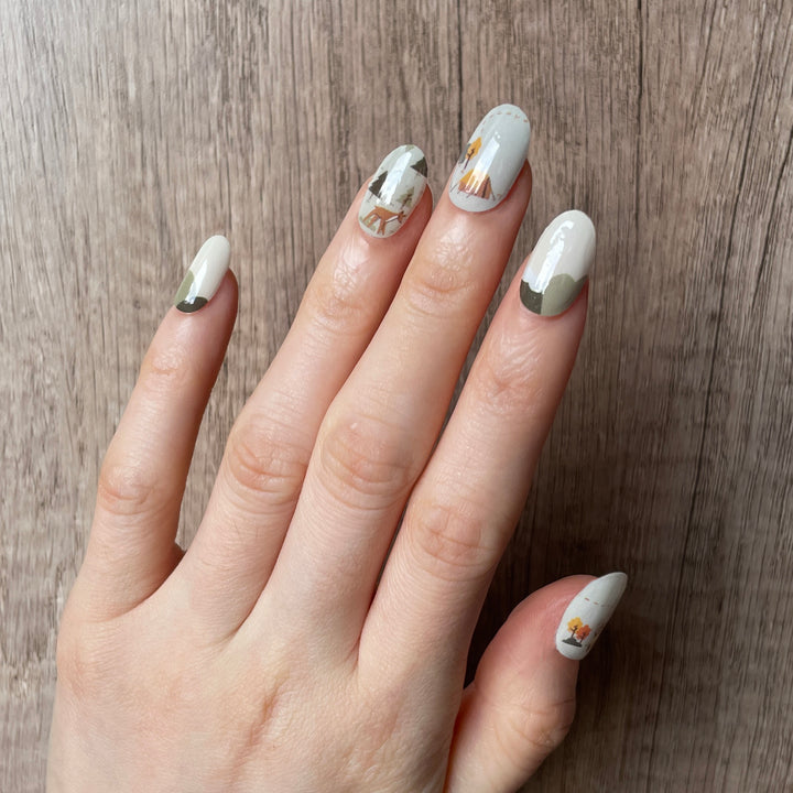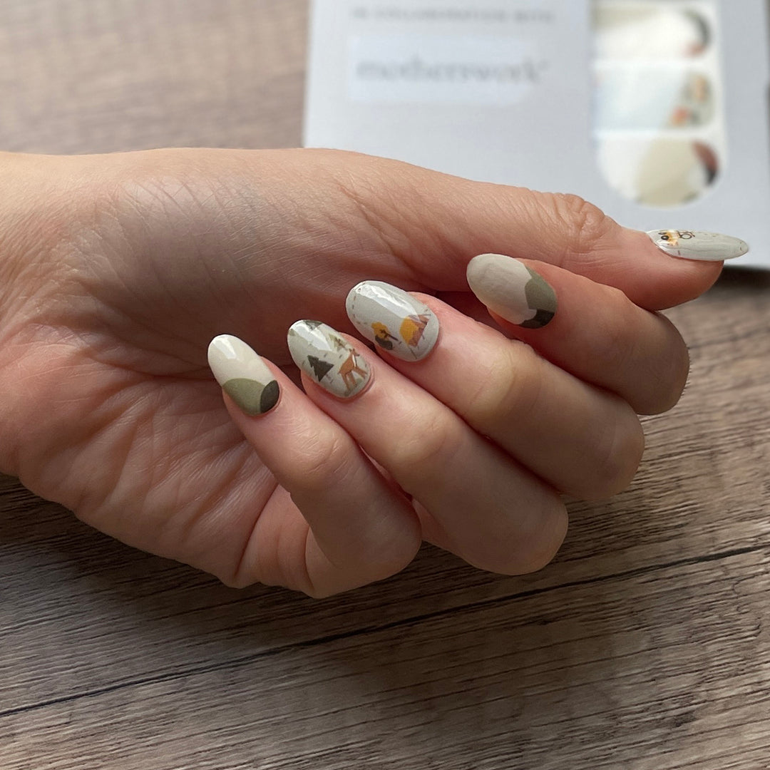 Celebrate your everyday beauty with this glistening set of pretty nails which features Motherswork's 25th Anniversary print, inspired by the great outdoors merged into a cute camping theme for the little ones. This fun and quaint nail art will give you the rustic and laid back vibes, allowing nothing to stand between you and your outdoor dreams!