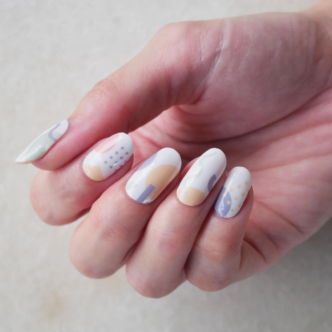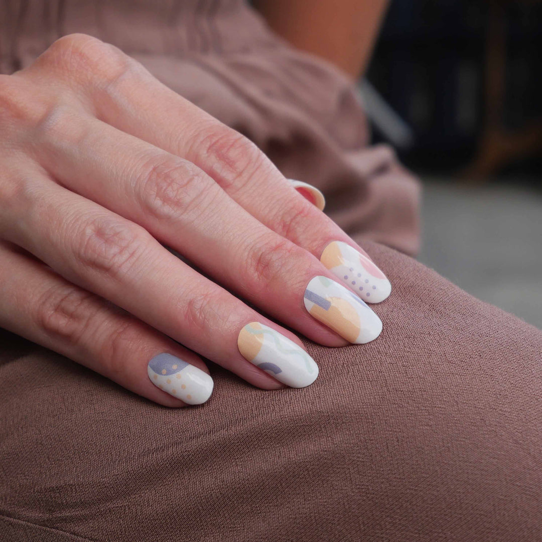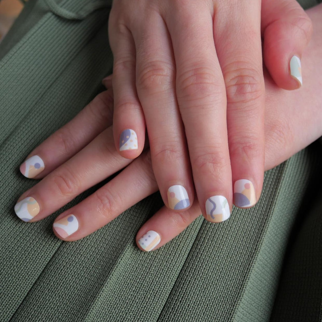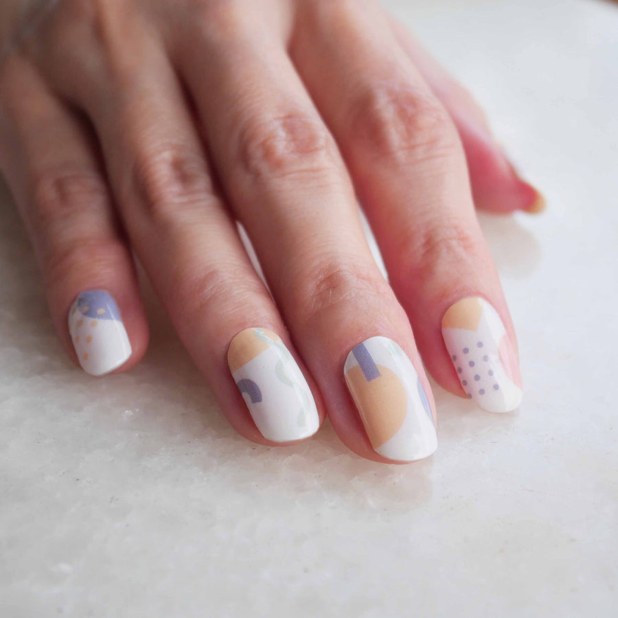 The Playful Blocks manicure is a fun and youthful manicure set that instantly elevates ones' mood. This abstract, geometric manicure can also bring much inspiration and personality to the creative, or if you'd just want to jazz up a simple outfit!