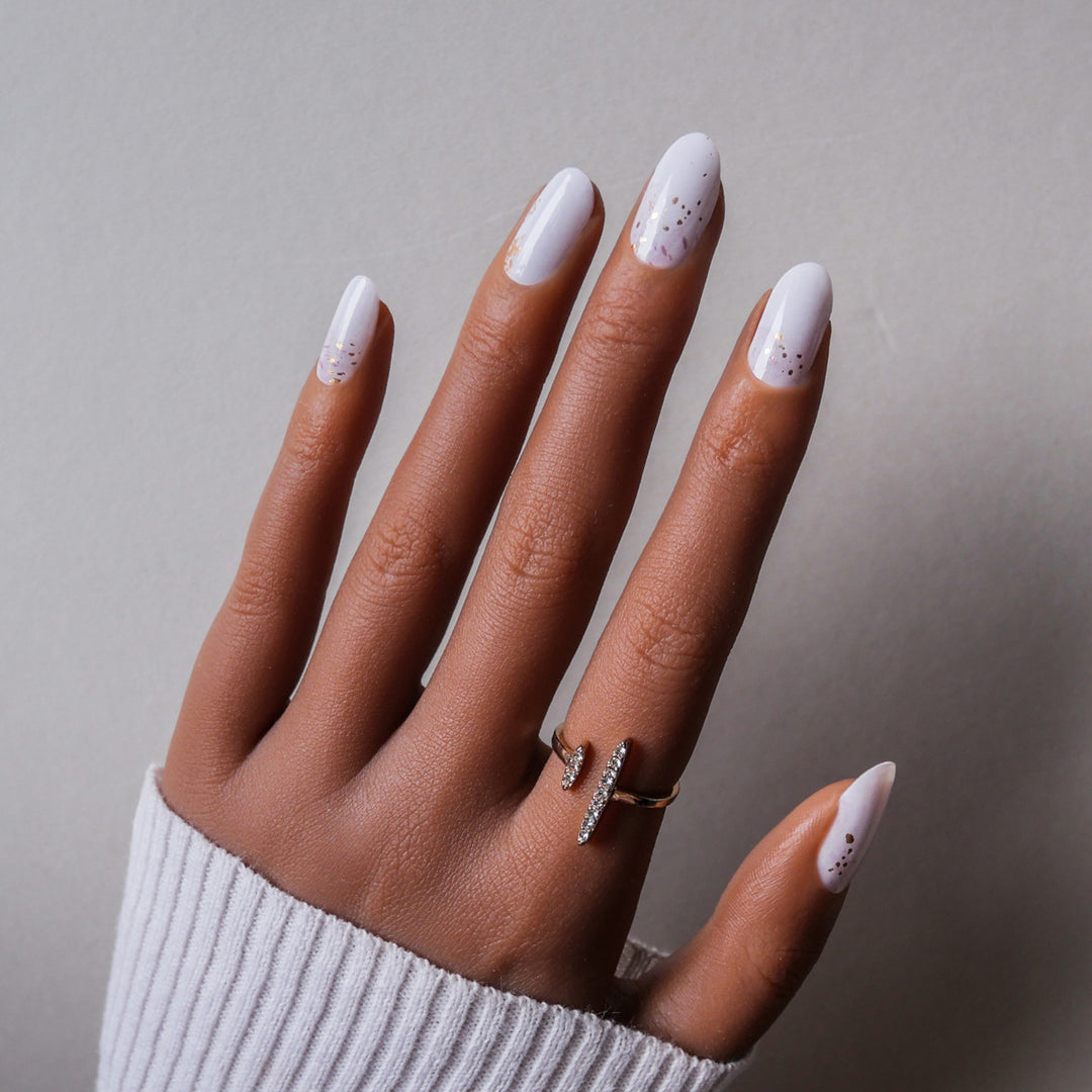 Sweet, feminine, and timelessly stylish, topped with specks of gold foil. This neutral set is perfect for the polished lady whose nails are always immaculate, but never stealing the show.