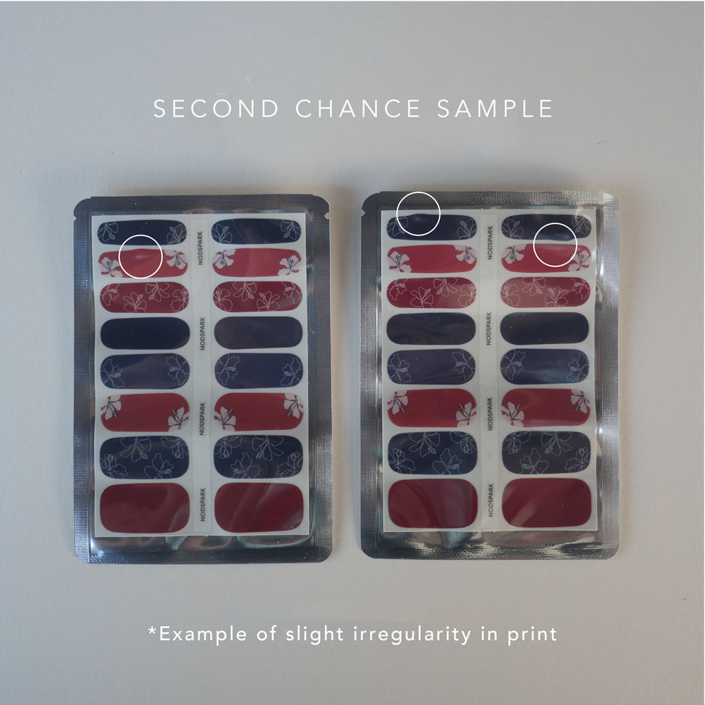 Second chance sets refer to functional nail wrap sets with slight defects that did not pass our quality checks. We’re letting them go at slashed prices in our efforts to reduce waste. Please purchase only if you’re comfortable with slight irregular prints as per the image example.