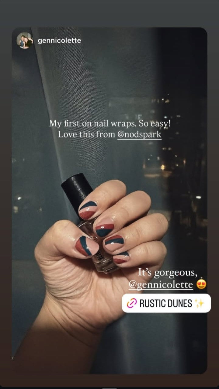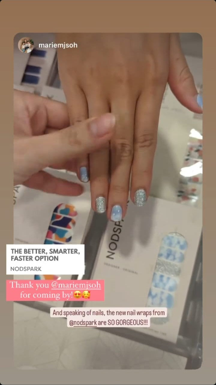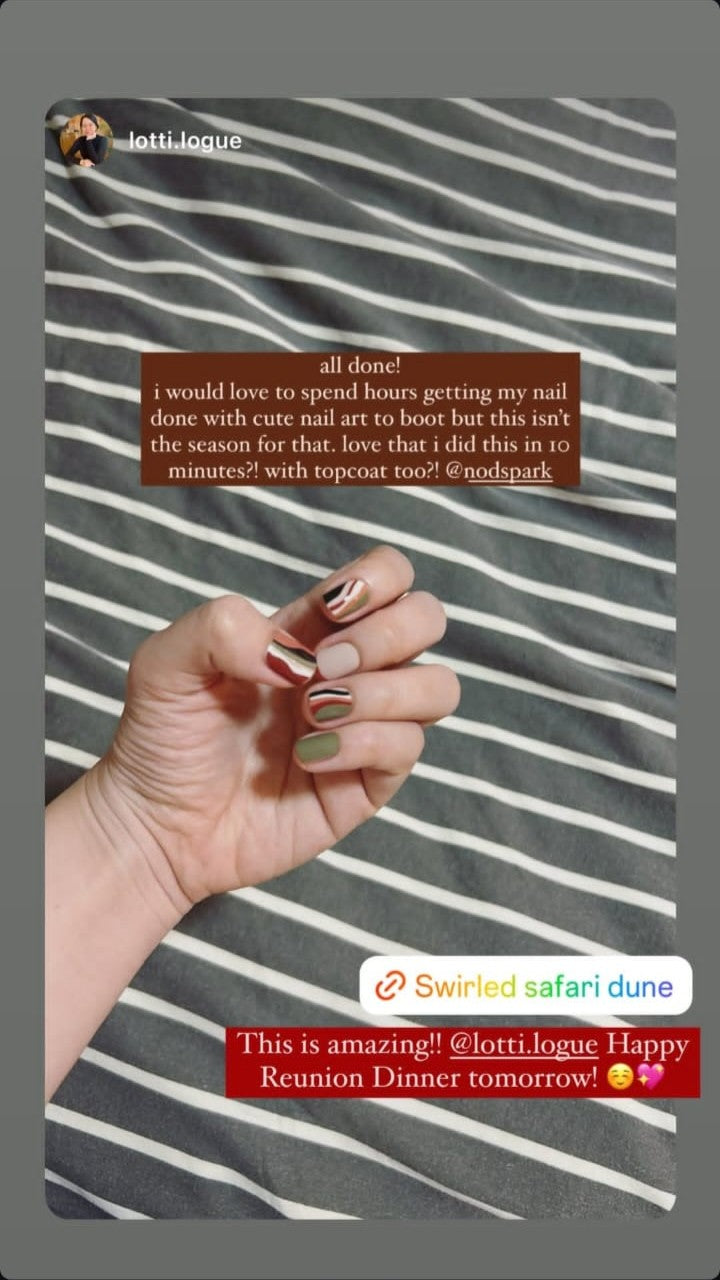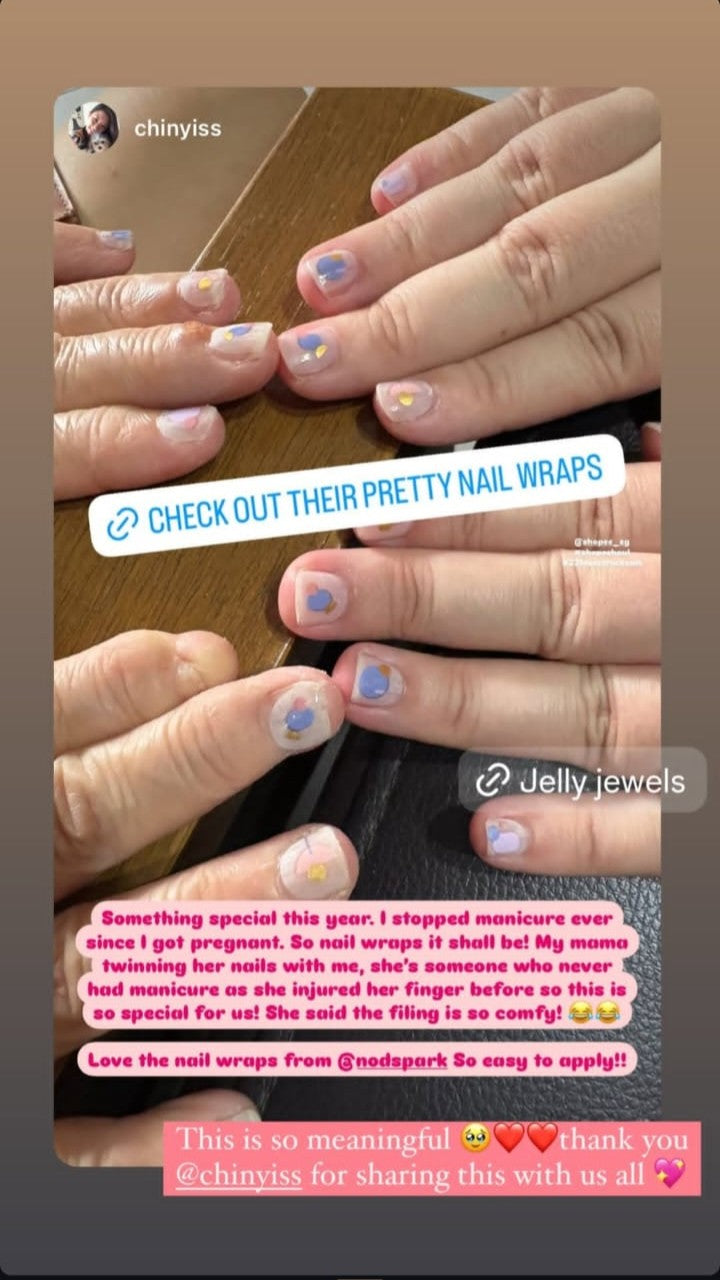 "Something special this year. I stopped manicure ever since I got pregnant. So nail wraps it shall be! My mama twinning her nails with me, she's someone who never had manicure as she injured her finger before so this is so special for us! She said the feeling is so comfy! Love the nail wraps from @nodspark So easy to apply!!"