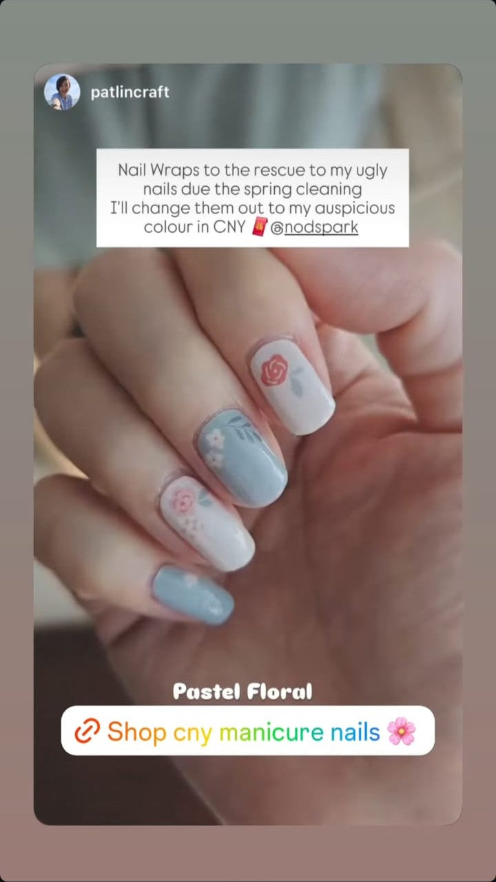 "Nail Wraps to the rescue to my ugly nails due the spring cleaning. I'll change them out to my auspicious colour in CNY @nodspark"