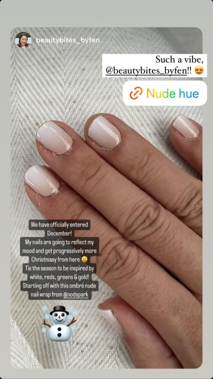 "My nails are going to reflect my mood and get progressively more Christmasy from here. Tis the season to be inspired by white, reds, greens & gold! Starting of with this ombre nude nail wraps from @nodspark"