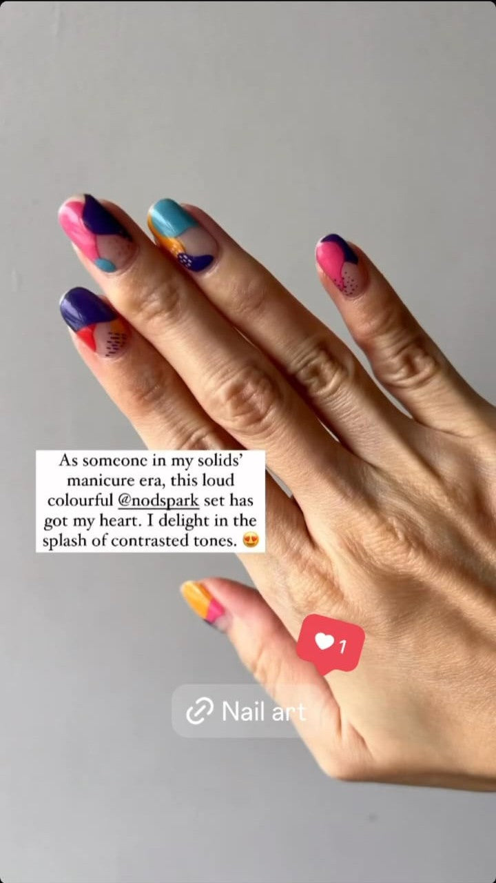 "As someone in my solids' manicure era, this loud colorful @nodspark set has got my heart. I delight in the splash of contrasted tones."