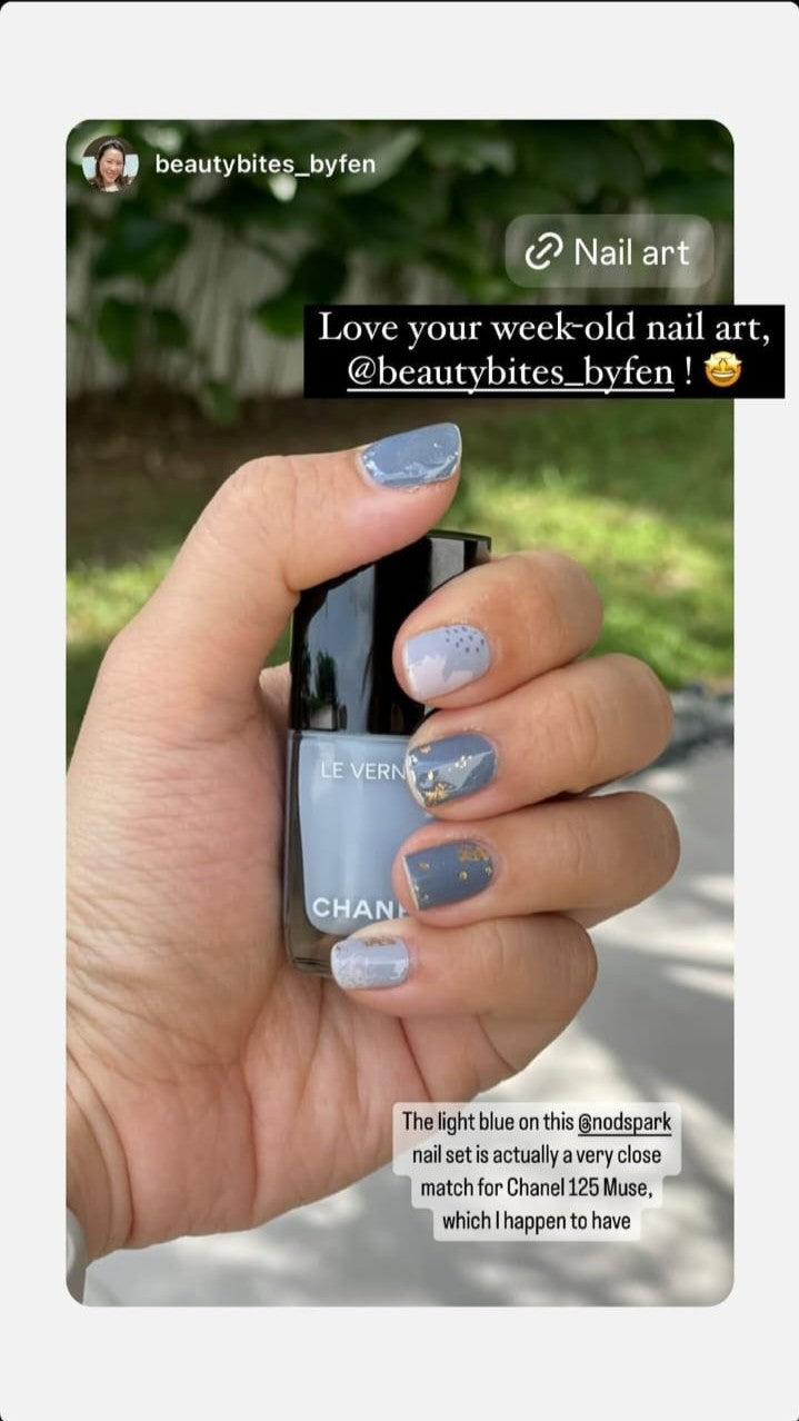 "The light blue on this @nodsaprk nail set is actually a very close match for Chanel 125 Muse, which I happen to have"