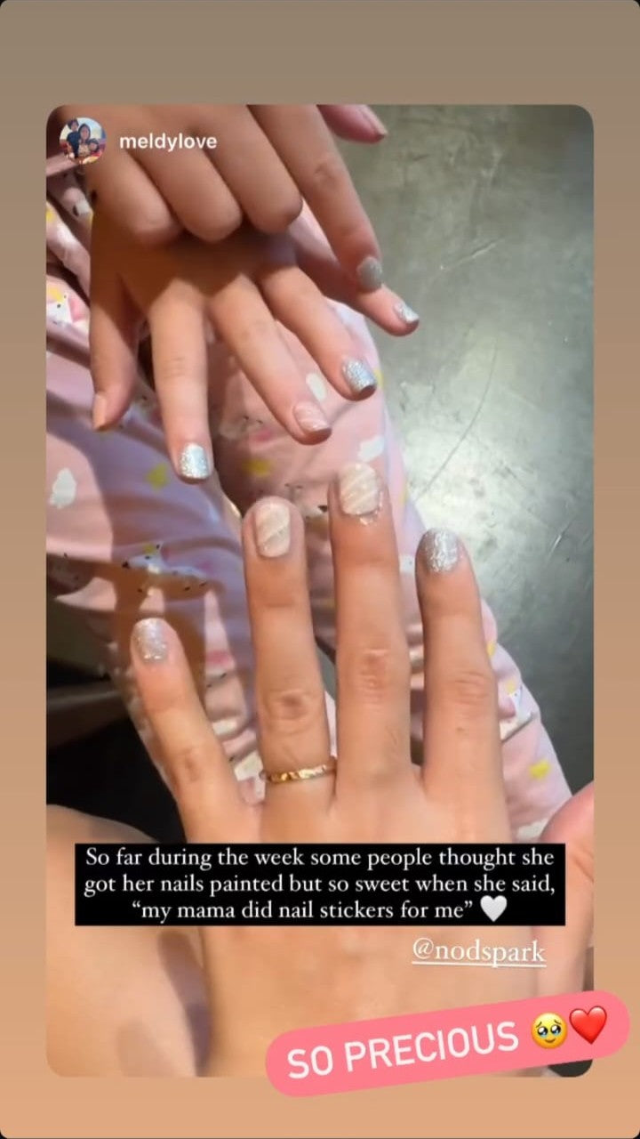 "So far during the week some people thought she got her nails painted but so sweet when she said, "my mama did my nail stickers for me""