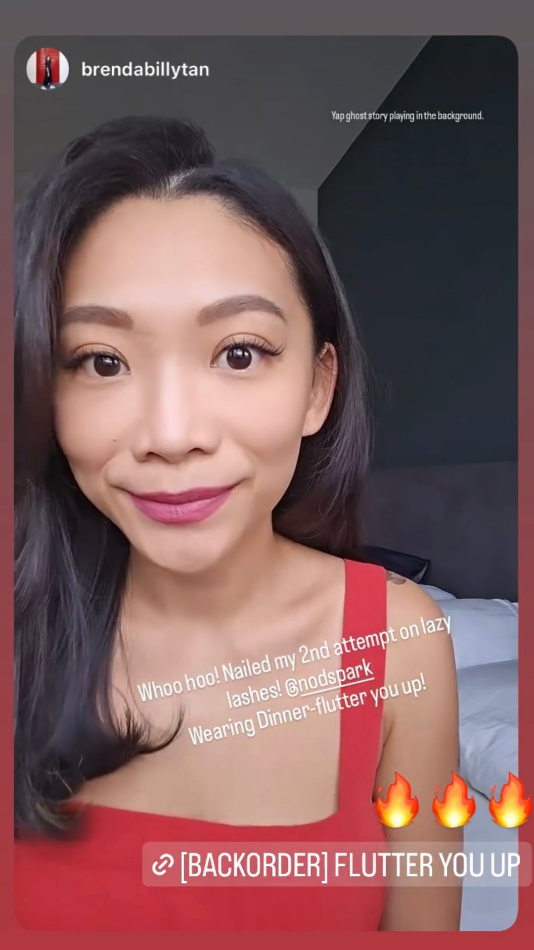 "Wearing @nodspark's Lazy Lashes in "Dinner Flutter You Up"!!! Zoomed in shots for a recent reels, might as well talk about my fav stick on lashes!!!"