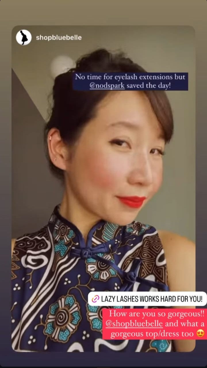 "Whoo hoo! Nailed my 2nd attempt on lazy lashes! @nodspark Wearing Dinner-flutter you up!"