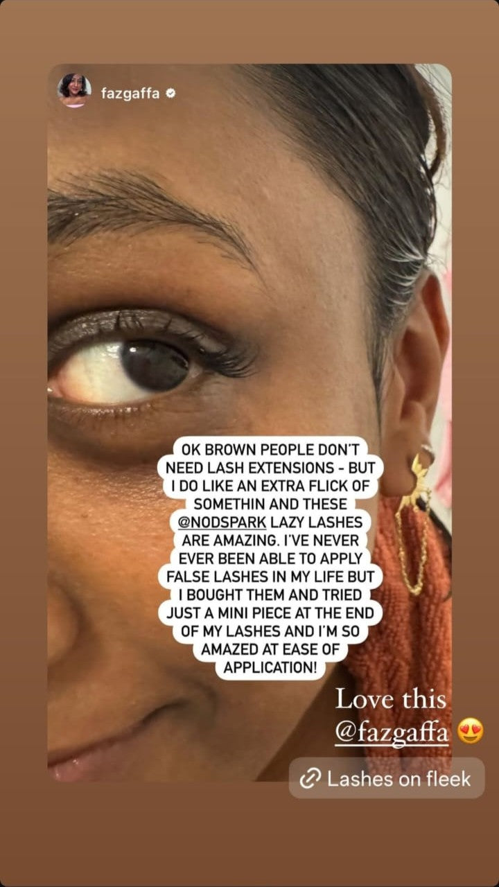 "Ok brown people don't need lash extensions - but I do like an extra flick of somethin and there @nodspark Lazy Lashes are amazing. I've never been able to apply false lashes in my life but I bought them and tried just a mini piece at the end of my lashes and I'm so amazed at the ease of application!"