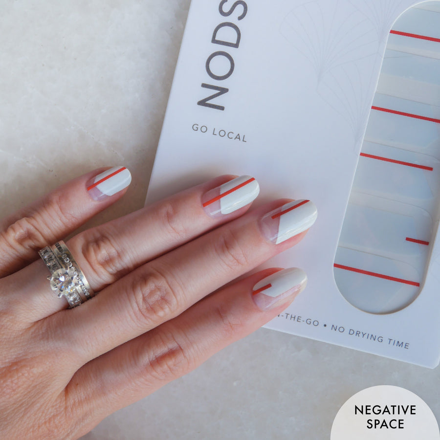 Say hello to Pin-stripe Twist, a modern cream white, paired with bright red lines resembling minimalist bowling alley pins! Sharply defined by its clean, negative space, Pin-stripe Twist is a perfect simple manicure set to have in your nail wardrobe.
